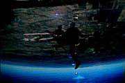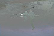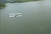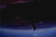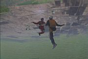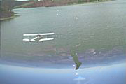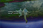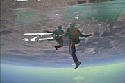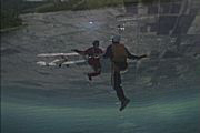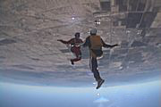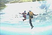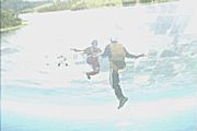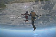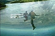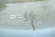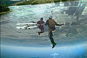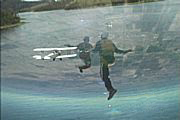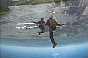 The following images are examples of blending the skydiving image as video A (background) and the image of the airplane flying above a lake as video B (foreground).