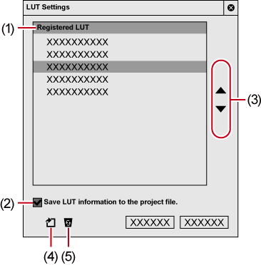 Sorts LUT. Selecting LUT from [Registered LUT] and clicking [Move up] or [Move down] move up or down the selected LUT. |