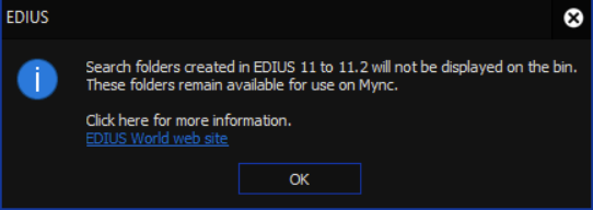 When loading a project created with an older EDIUS 11 build that includes a search results folder, the below dialog will appear.